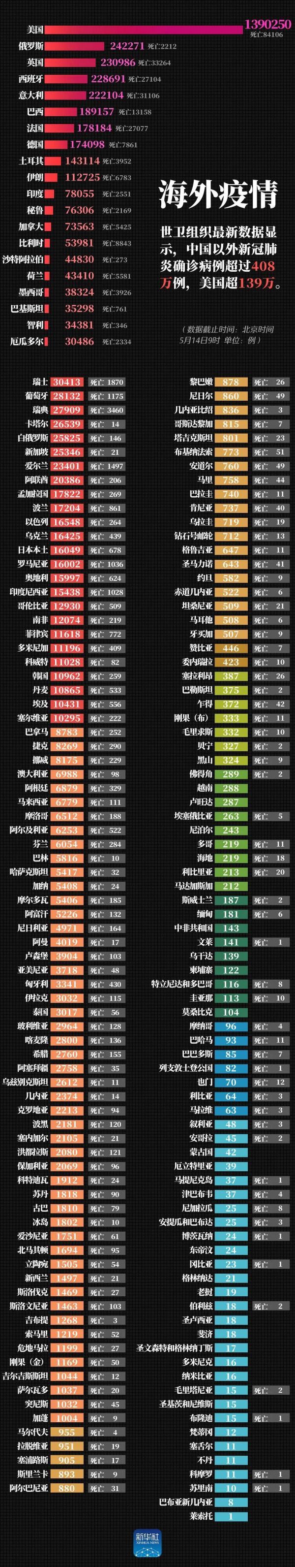 最新!美国超139万例,中国以外确诊病例超过408万例
