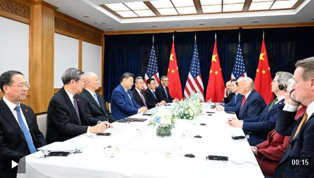 当地时间10月30日上午,国家主席习近平在釜山同美国总统特朗普举行会晤。