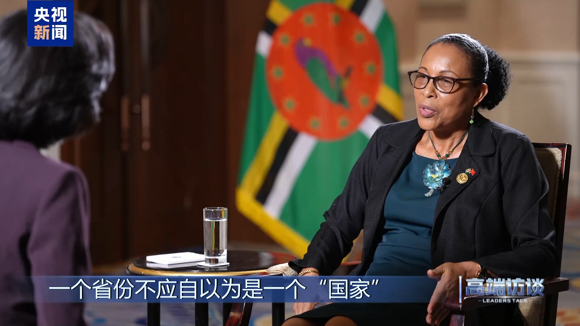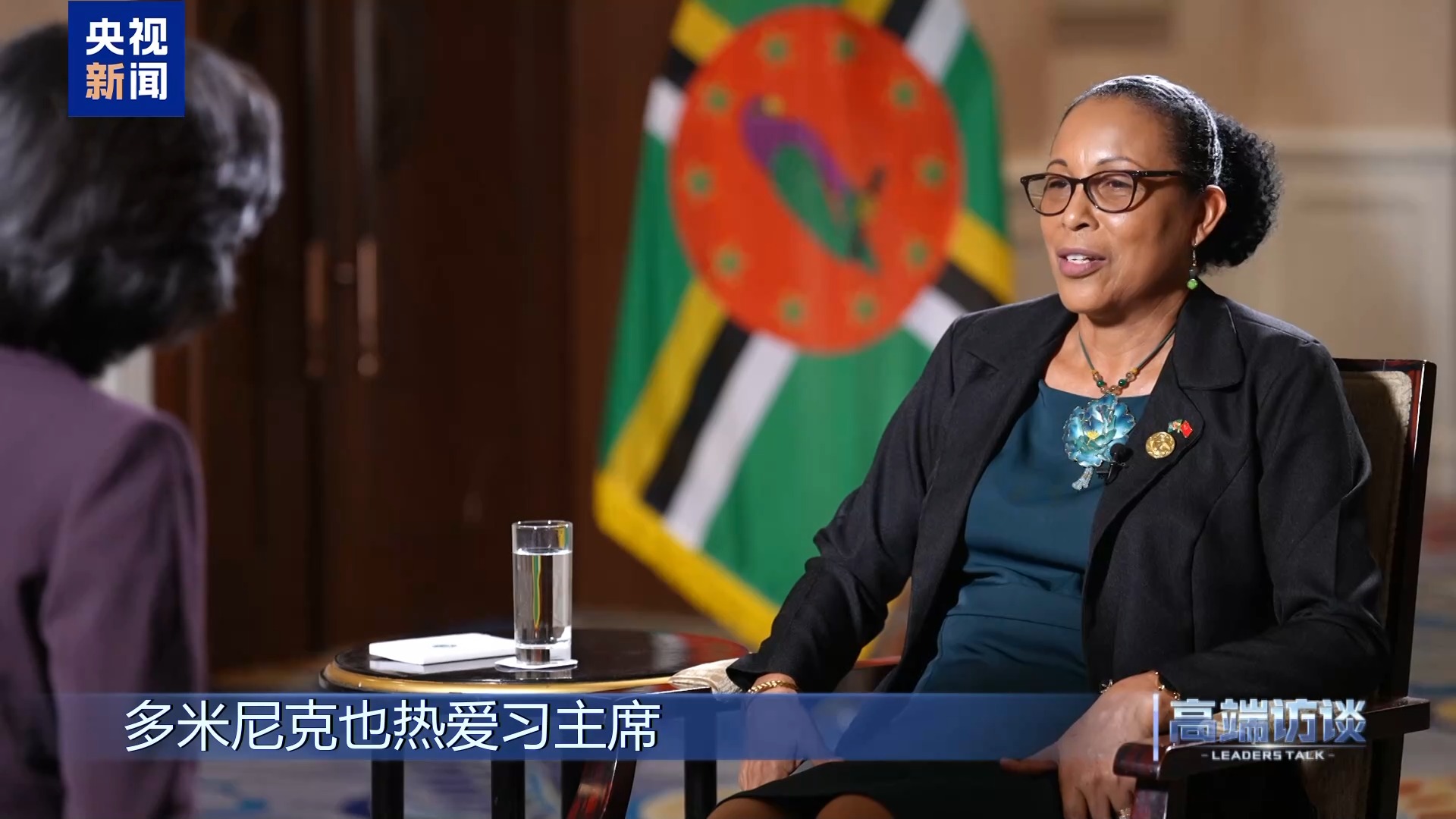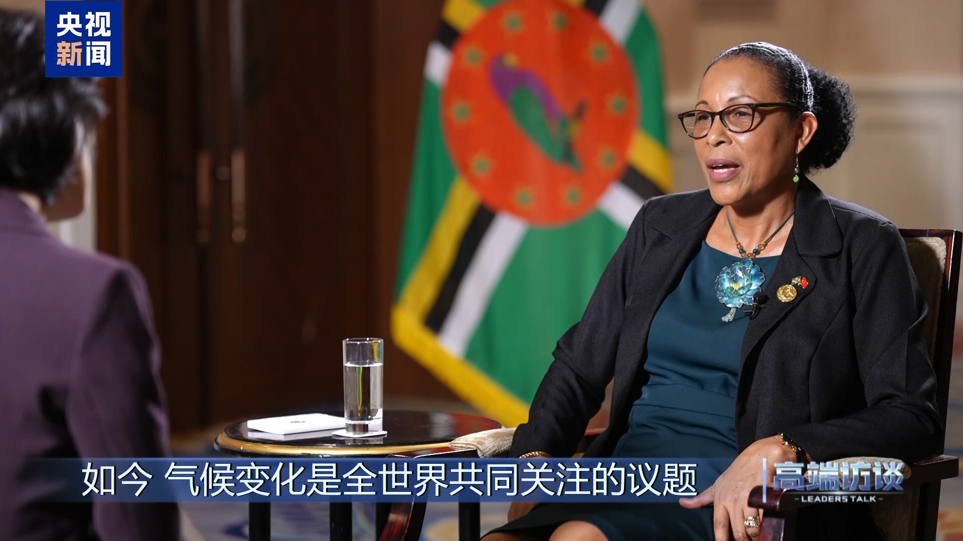 多米尼克总统伯顿接受《高端访谈》专访。她说,在多米尼克遭遇危机的时刻,中国的支持发挥了重要作用。她表示,共建“一带一路”倡议对多米尼克意义重大。