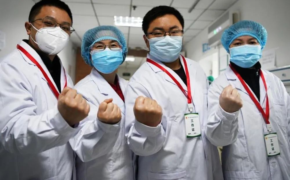 图为四川大学华西医院援湖北医疗队朱仕超(右二)与同事相互鼓励打气。