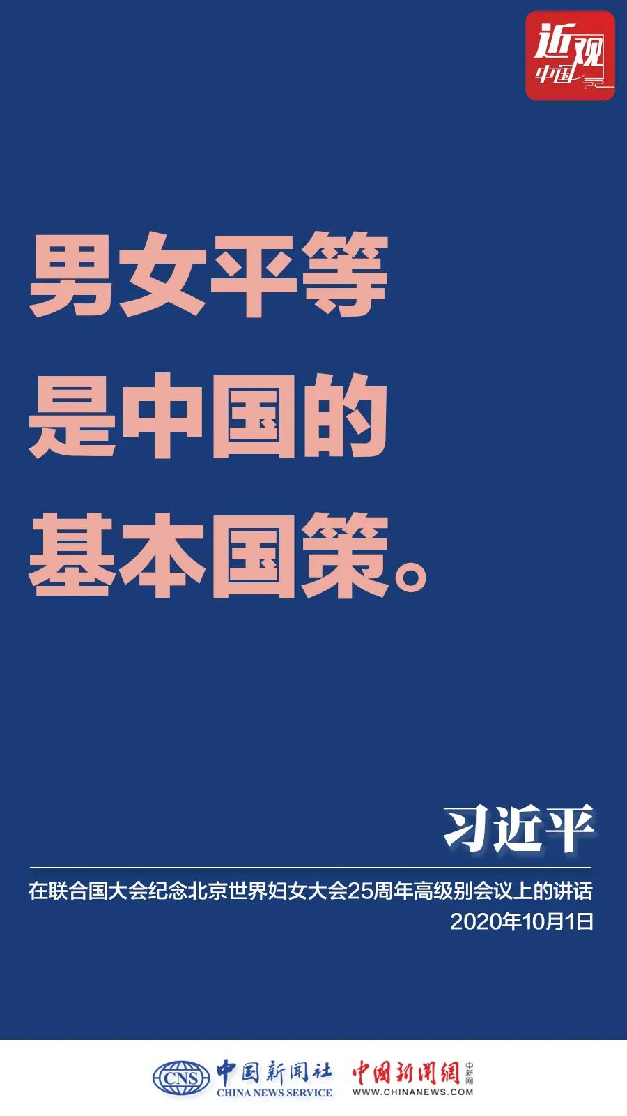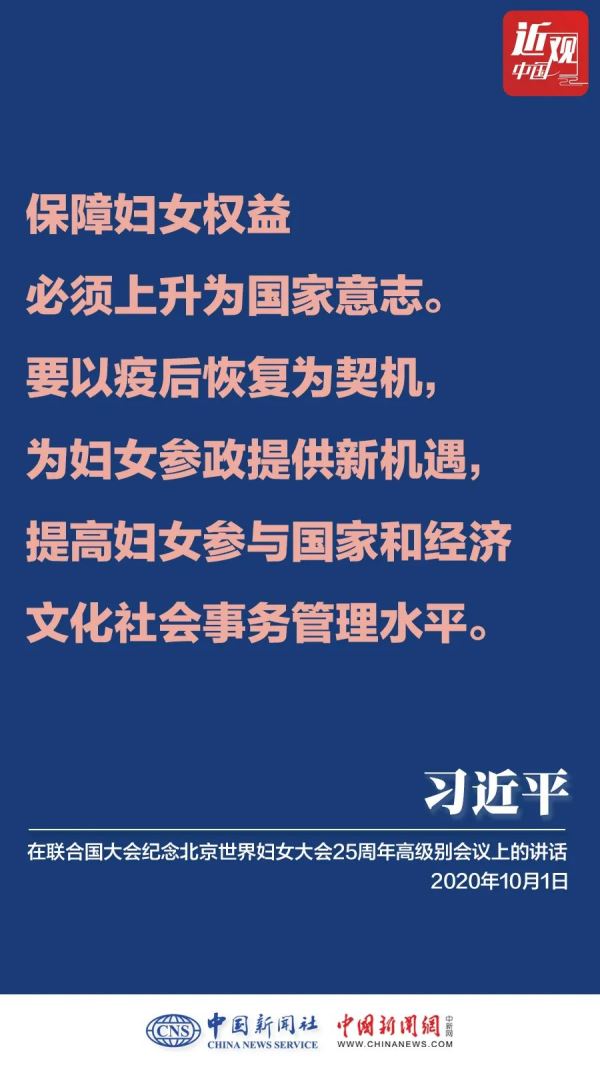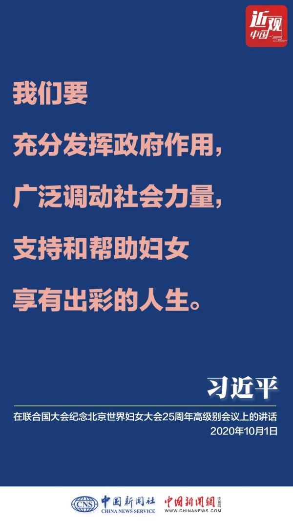 10月1日,国家主席习近平在联合国大会纪念北京世界妇女大会25周年高级别会议上通过视频发表重要讲话。他强调——