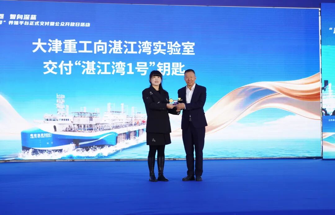 在各方见证下,建造方天海融合防务装备技术股份有限公司将象征启航的钥匙,正式移交给湛江湾实验室,实验室自主研发设计的全球首创漂浮式动力定位网箱型平台成功交付,标志着我国海水养殖从近海走向深远海的征程,迈出了坚实一步。