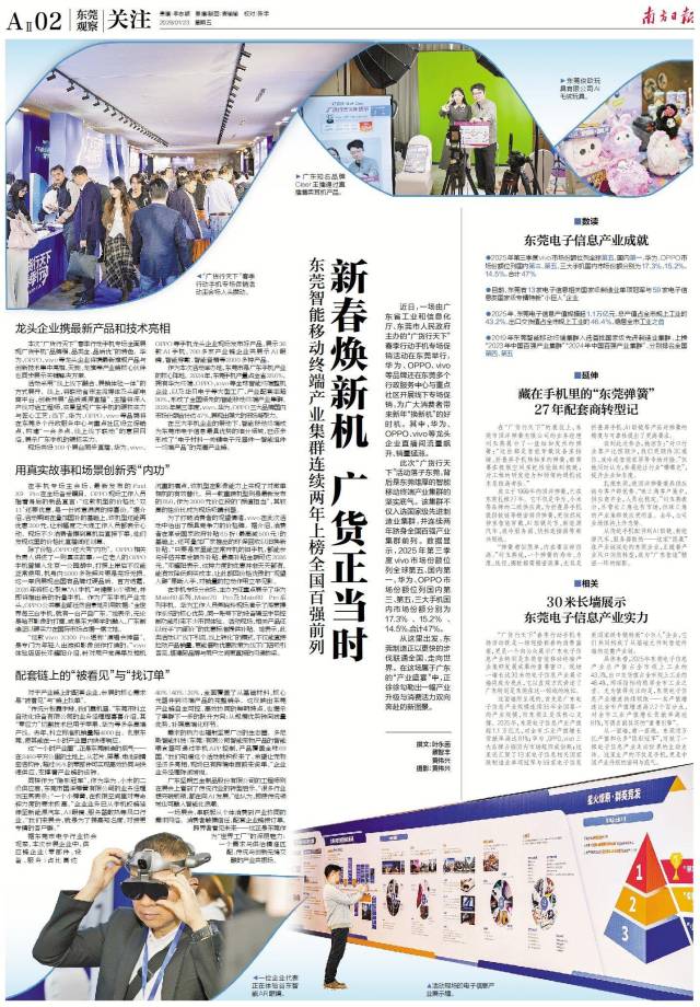 这面墙所呈现的,首先是广东电子信息产业规模连续35年全国第一的产业规模,而东莞正是其核心支撑。2025年,东莞电子信息产业产值超1.1万亿元,对全市工业产值增长贡献率高达81%;华为、OPPO、vivo三大品牌占据国内市场超四成份额;这里还汇聚了13家电子信息相关国家级制造业单项冠军与59家电子信息类国家级专精特新“小巨人”企业,它们共同构成了从基础元件到智能终端的完整产业链。