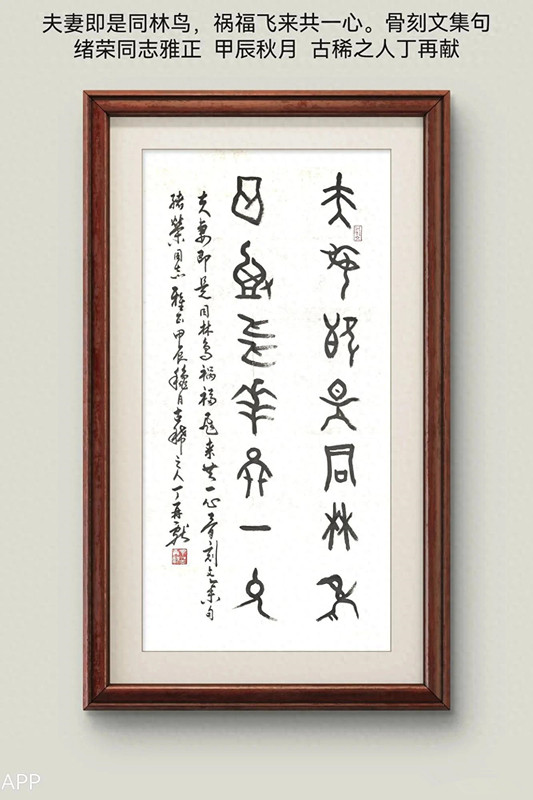 今天在济南历山名郡丁再献老先生家中,有幸欣赏到了丁老为全国拥军爱民模范、部队红旗哨所、模范夫妻哨所所长谢世强、鲁绪荣夫妇题写的骨刻文艺术书法: