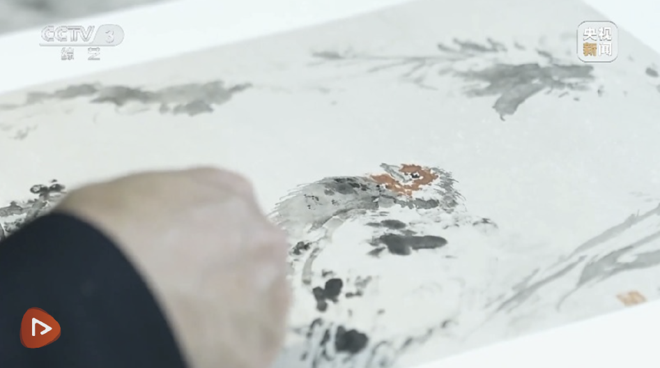 中国国家画院院长中国美术家协会副主席刘万鸣:指头你放到哪儿,你必须很准确,这需要技法的锤炼,这个鸡冠就出来了。一定要感觉点、擦、皴、勾一块儿运用,让它变化丰富一点,虚实关系就出来了,手指头点和毛笔点也不一样,这时候我就大胆用水,水和墨的关系,但是造型能力你必须(精准),这都可以用,这些你先不管它,找细部,羽毛的感觉。