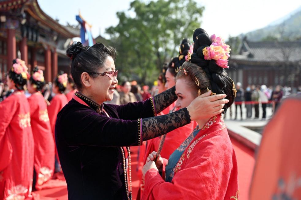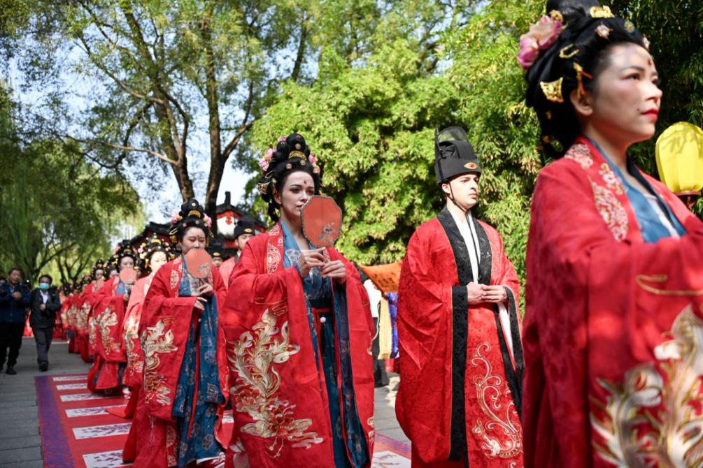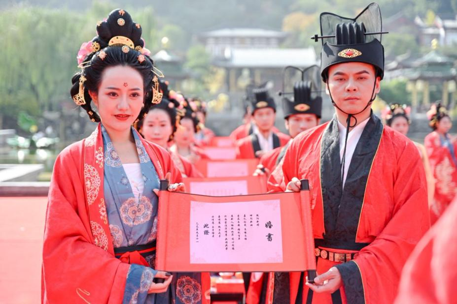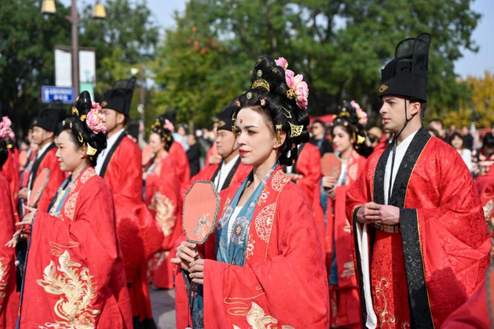 此次活动吸引30余对嘉宾参与体验,有来自全国各地的爱侣,还有来自泰国、俄罗斯、巴基斯坦等国家热爱中国传统文化的朋友。嘉宾身着精心复原制作的唐装华服,化精致唐妆,体验唐代婚仪。却扇、沃盥、拜天地、同牢、合卺、共结镜纽等富有文化内涵的仪式,让参与者深刻感受到中华传统文化的博大精深。