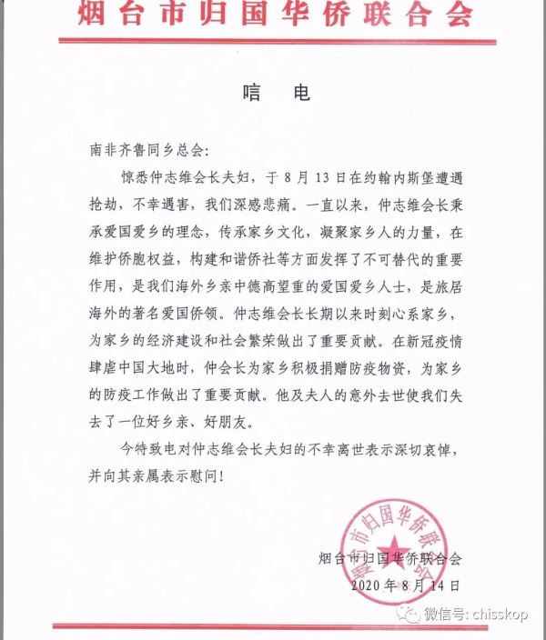 在悲痛之余,我们感念家乡政府的关怀和支持。山东省人民政府侨务办公室,山东省人民政府外事办公室,青岛市侨务办公室,青岛市侨联,烟台市侨联,东营市侨联等政府机构给我会发来唁电,强烈谴责歹徒的无耻暴行,诚挚慰问仲会长夫妇的家人,赞扬仲志维会长"作为海外山东人的杰出代表,发扬爱国爱乡传统,凝聚侨心侨力,为构建和谐侨社,平安侨社等方面发挥的重要作用。团结南非山东籍乡亲抗击新冠疫情,共克时艰,为推动山东和南非各领域的民间交往发挥了重要作用。'"