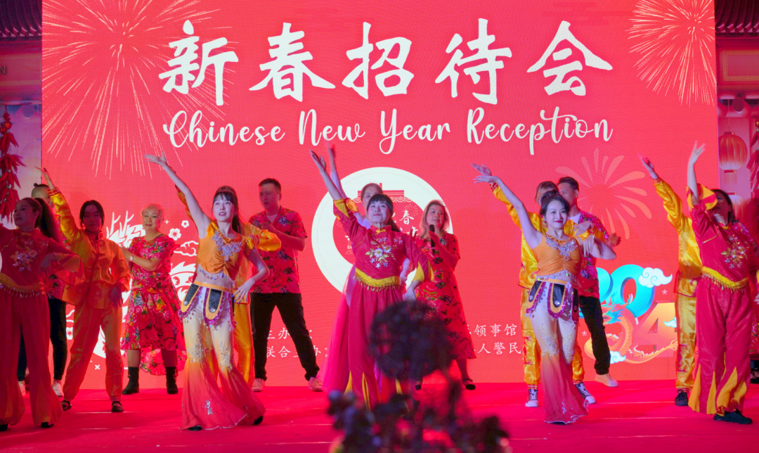 精彩热烈的舞狮表演为招待会拉开序幕,带来欢快喜庆的节日氛围。来自中资机构、侨团及当地的中南各界人士联袂奉献了精彩的文艺演出。歌舞《欢乐中国年》《相亲相爱》和无伴奏合唱《Jungle Groove by Wildlife》赢得阵阵喝彩。新疆舞《亚丽古娜》婀娜曼妙,体现中国文化多样性。当地特色的非洲鼓和祖鲁舞表演点燃现场气氛。合唱《天地龙鳞》和中国鼓表演契合龙年主题,铿锵有力、掷地有声,展现了中华民族的气节与韧性,将招待会氛围推向高潮。