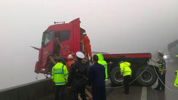 事故现场位于田湾大桥上,货车车头已经伸出了桥面,距离地面约有130多米,再加上现场路段有雾,能见度较低,如果发生二次交通事故,后果不堪设想。为了尽快营救出被困驾驶员,路政员一边电话安抚驾驶员,一边在路面摆放安全警示标志,引导提醒过往车辆。同时也联系其他部门救援力量赶到现场。