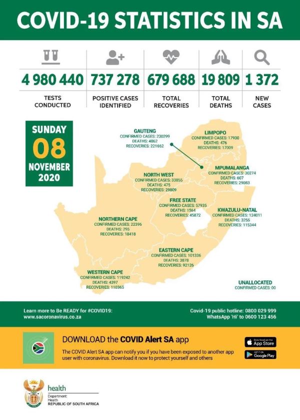 11月8日,南非新冠肺炎新增1372例,新增死亡20例,全国累计治愈679688例,累计确诊737278例,累计死亡19809例。