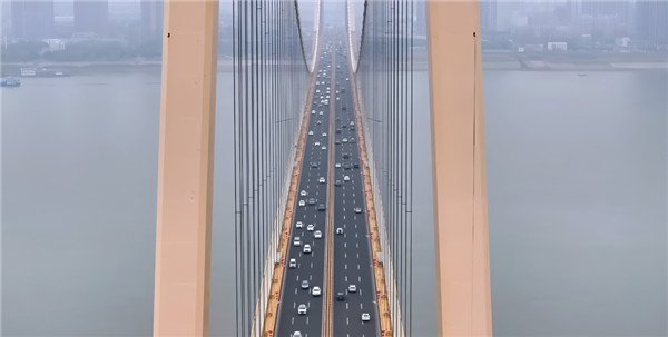 (在武汉杨泗港长江大桥上自动驾驶车辆与社会车辆并行穿梭)