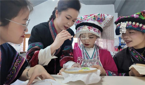 (全国人大代表、布依族服装技艺非遗传承人李利在指导绣娘)